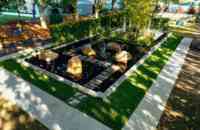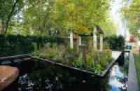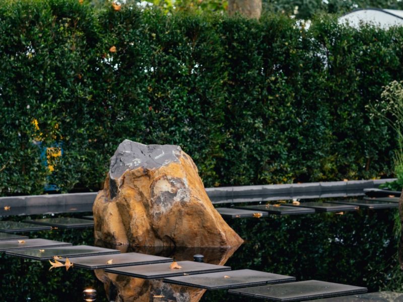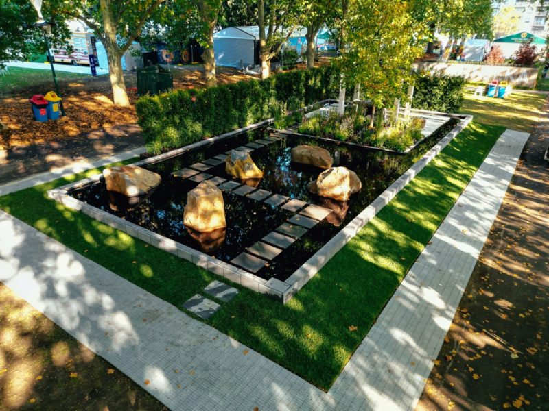 The central boulevard 200 square meter show garden is a contemporary vision of a love story, and two hearts separated by a small island off the coast of Galway to the mainland. Featuring a series of natural bluestone steps that symmetrically weave their way through a rocky landscape, recognisant of the journey made across the Atlantic from the Connemara coast. The destination is a limestone (moleanus) island featuring planting, shelter, and a single 8 metre tall Liriodendron tulipifera reflecting across the black water, a beacon to those who wish to return to their love.