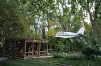 The garden features a fragmented path winding to an aged, grassed roof wood cabin and a Piper PA-28 Cherokee aircraft, the project that once was a wished for return to flight of a then younger man, not complete in its repair or trajectory stalled by tree growth over time, stimulated only by the turbulence of what comes with the witness of conflict.