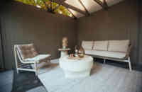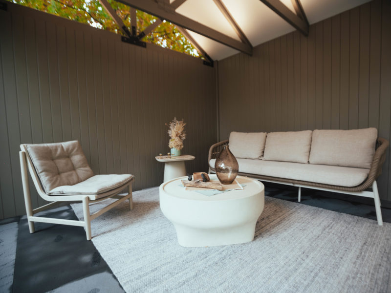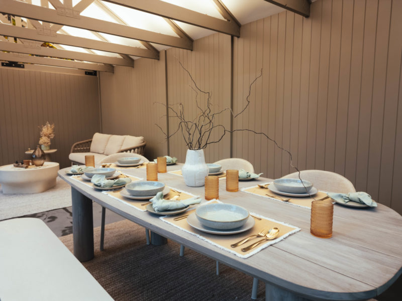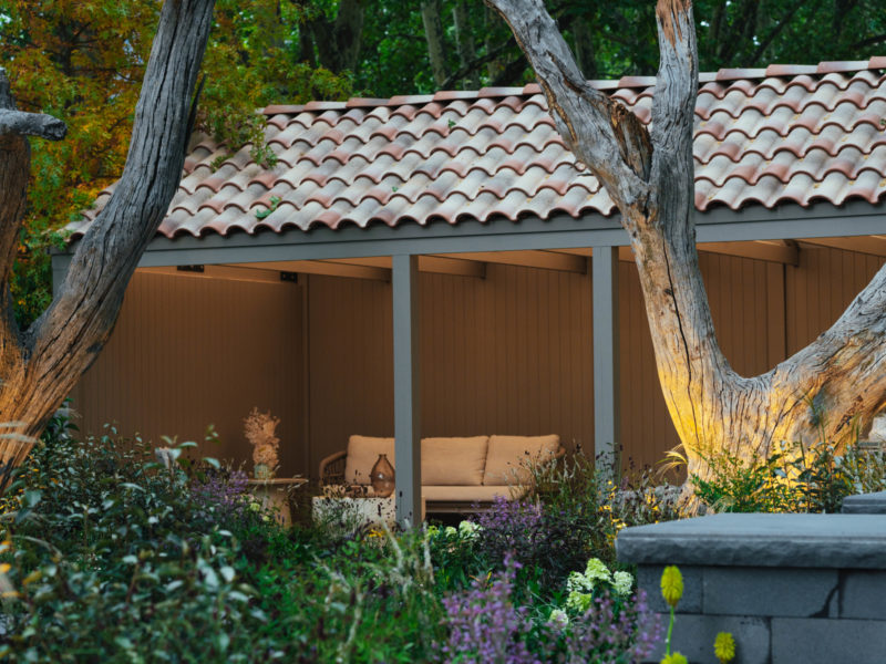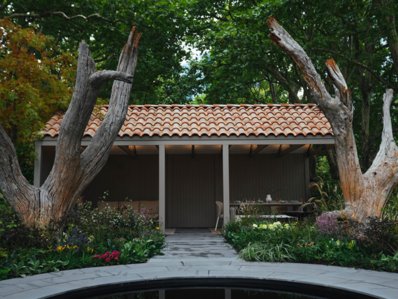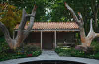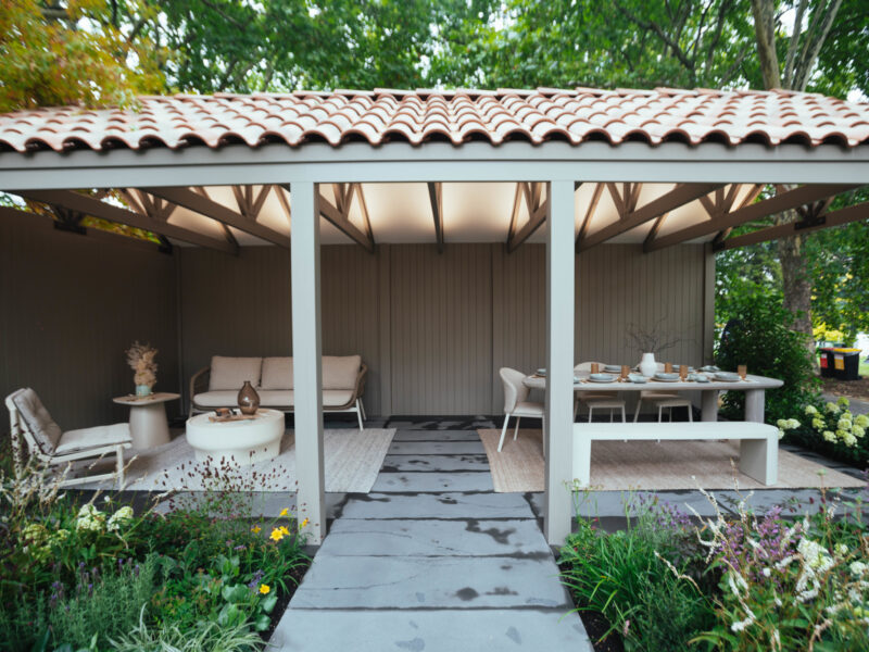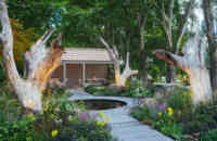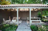 The timber structure with a tiled roof and bluestone paving evokes a sense of permanence, refuge and support. It reflects the secure foundation and nurturing environment the landscape industry offers its community.