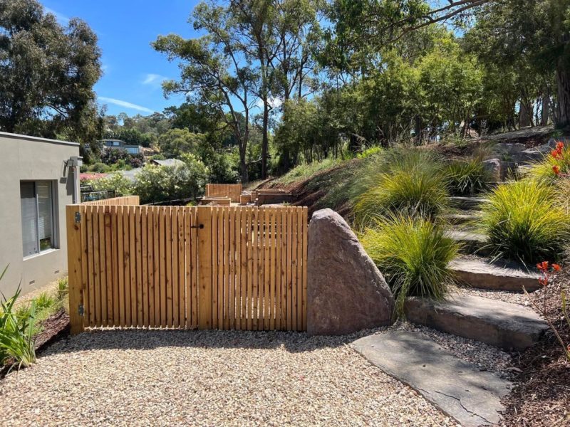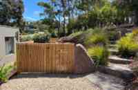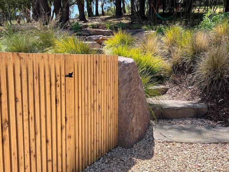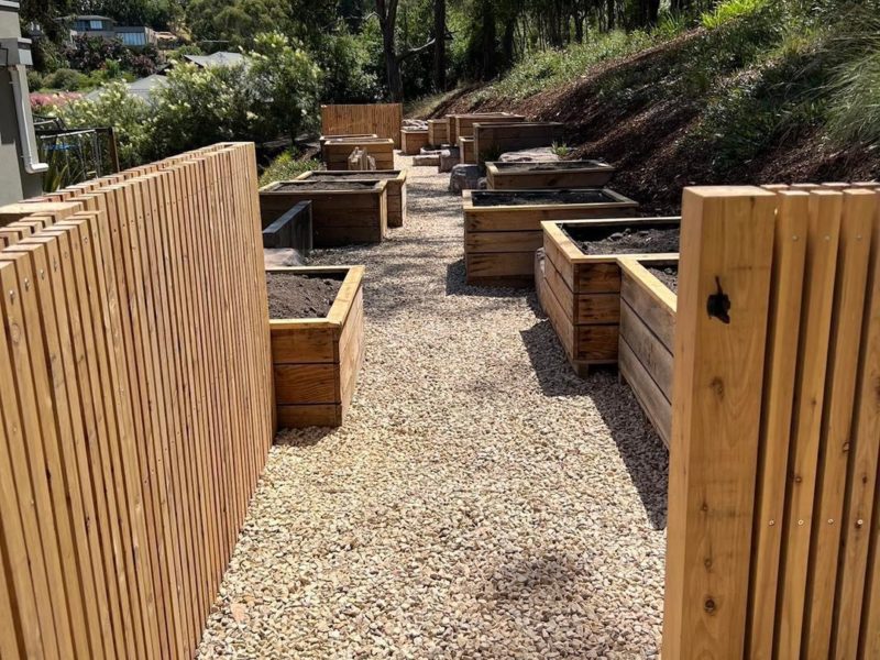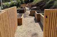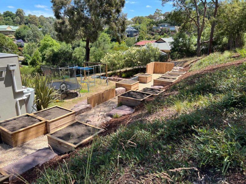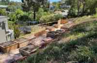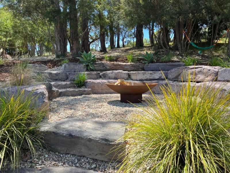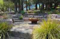 Tiered rock work, fire pit area and vegetable garden constructed by Semken Landscaping